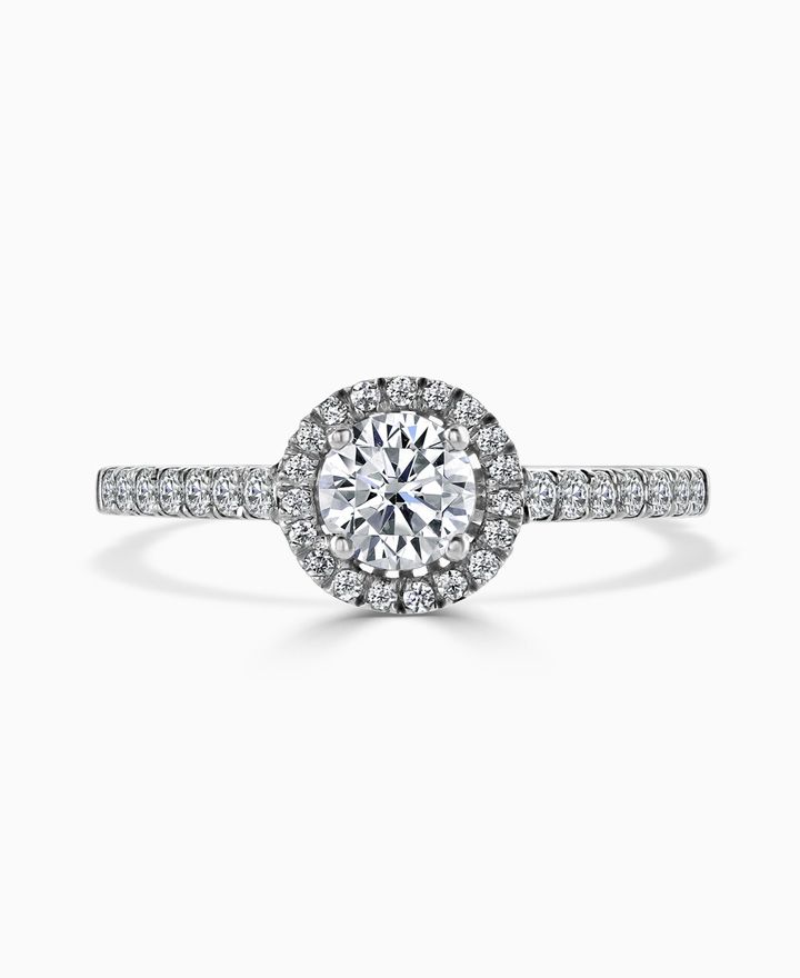 A Brown & Newirth diamond halo engagement ring that says I love you from the first kiss to forever. The classic round brilliant diamond is framed by a halo and diamond shoulders with swirl detail underneath. Questions? Call us on 01702 480 898 to find out more.