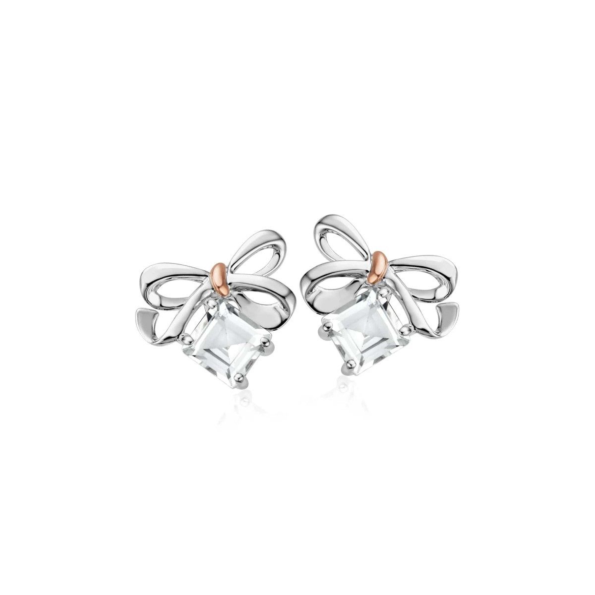 These fabulously festive Clogau Christmas Bow White Topaz Silver Stud Earrings will add style to any outfit. Featuring princess cut white topaz and a touch of rare Welsh rose gold, they also make a special gift.