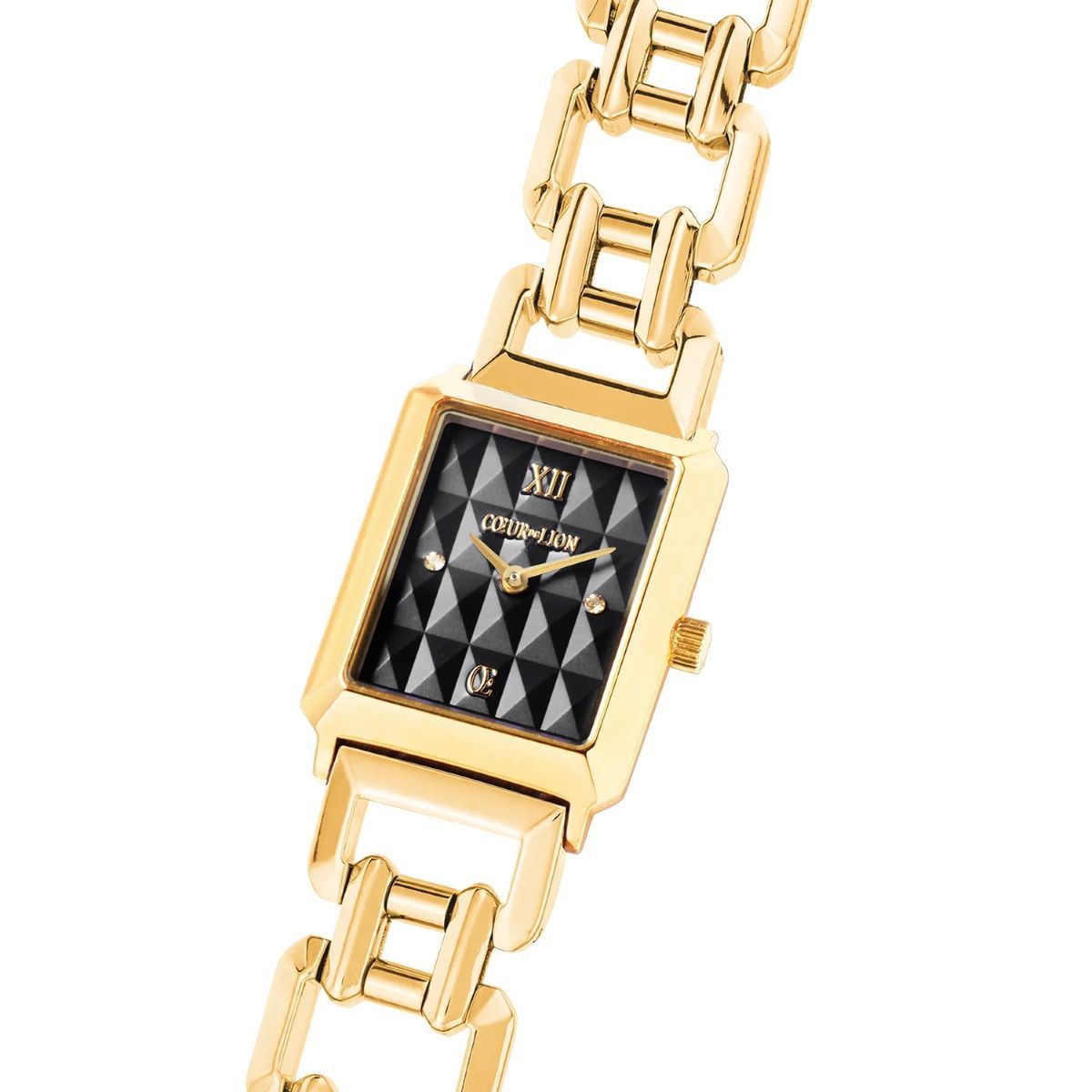 The Iconic Coeur De Lion Spikes Black Statement Gold watch combines bold elegance with modern luxury. Its black dial features sparkling zirconia, while a gold stainless steel bracelet adds a distinctive touch.