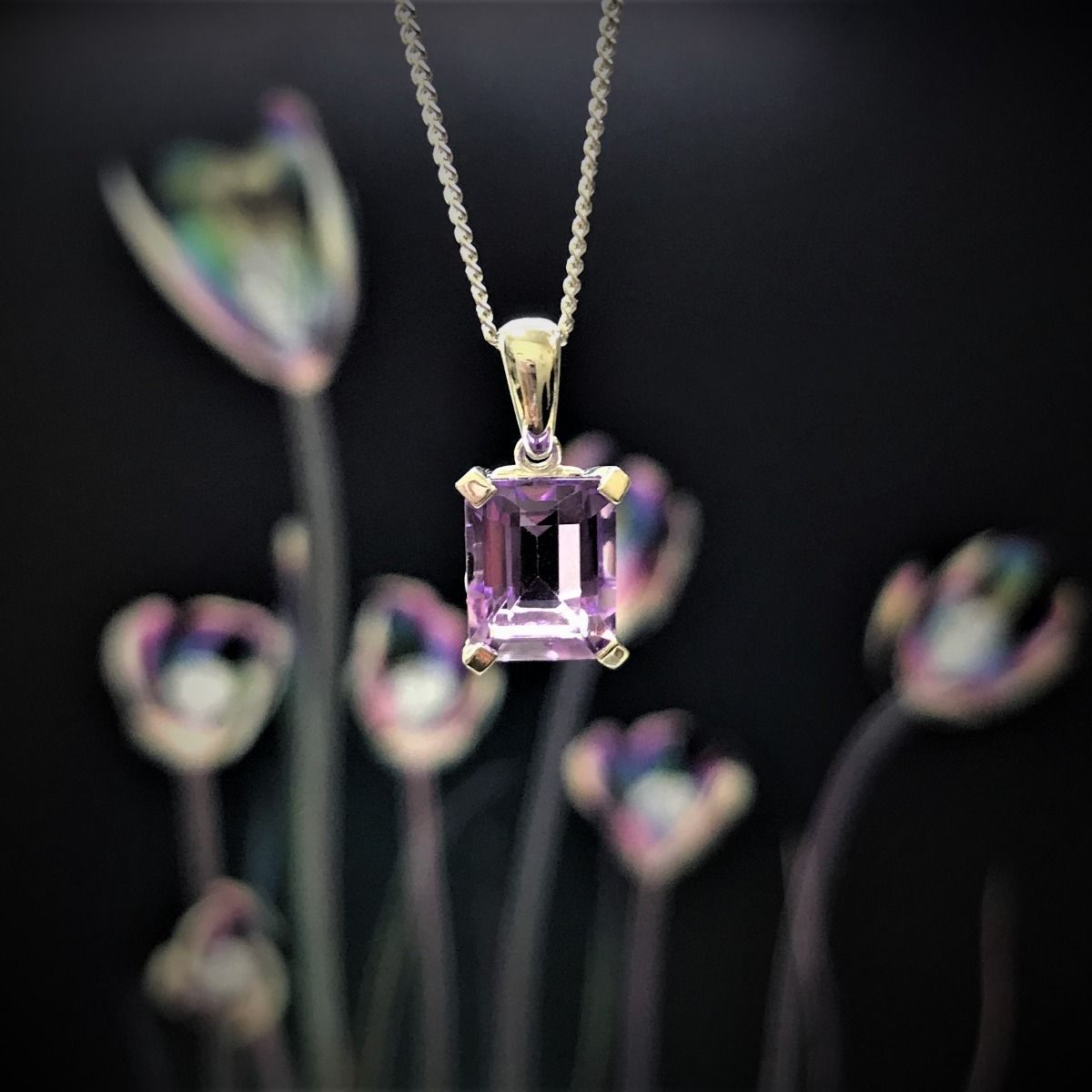 This amethyst rectangle pendant by Elements Gold is a stunning design featuring a brazilian amethyst set into 9ct white gold on a white gold chain.