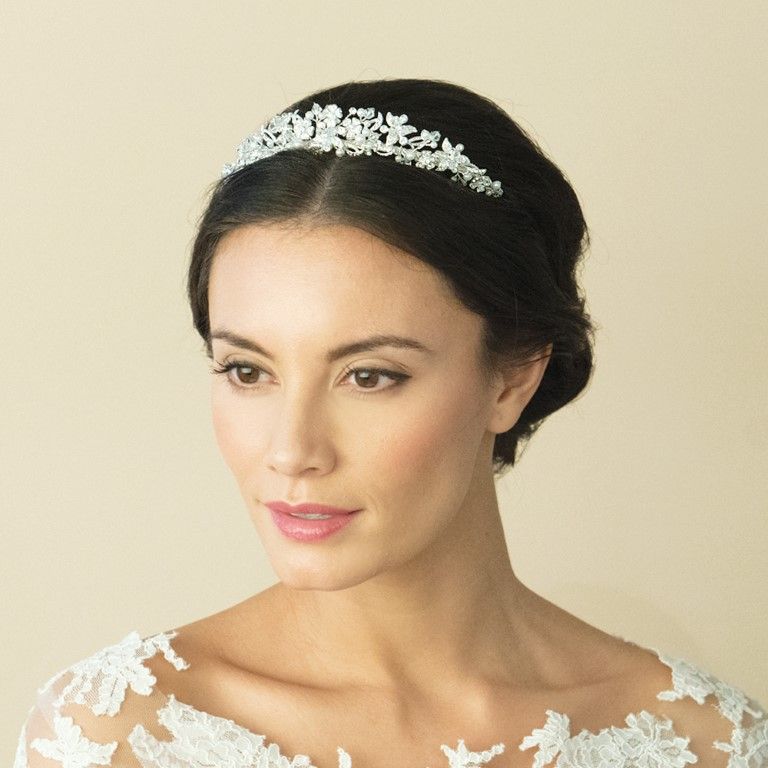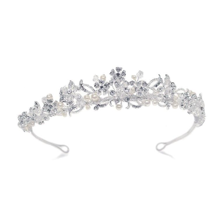 Hyacinth is a really pretty and delicate tiara created using cut solitaire stones set in an elaborate pattern of flowers and swirling banners, accented by sparkling cut crystal beads and natural lustre man-made pale ivory pearls.