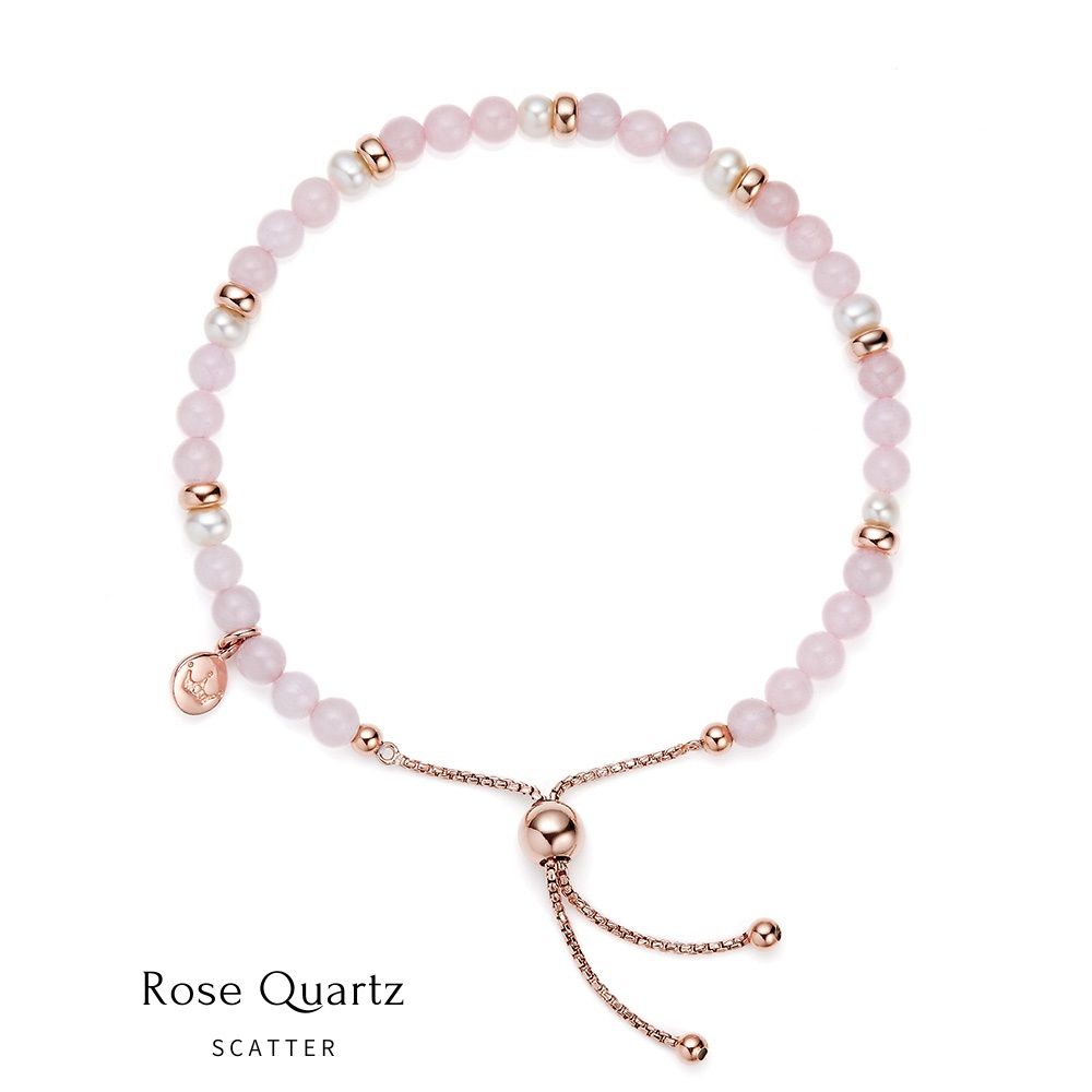 This Jersey Pearl bracelet features semi-precious rose quartz stones, scattered beautifully across its adjustable length bracelet and interspersed with freshwater pearls. Wear alone or mix and match with other gemstone, pearl or rose gold jewellery.