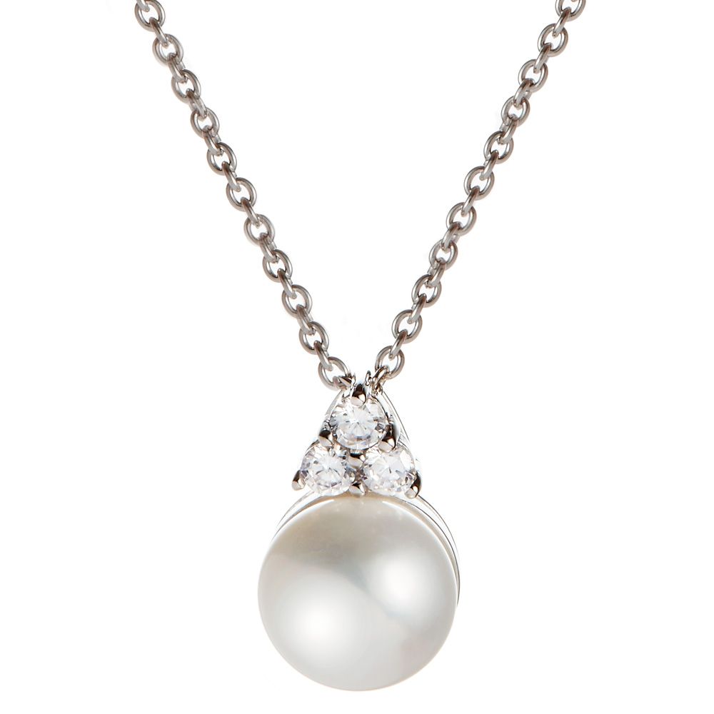 A sterling silver and freshwater pearl pendant set with a trio of cubic zirconia. This Jersey Pearl pendant is easy to wear everyday, but also perfect for a special occasion.