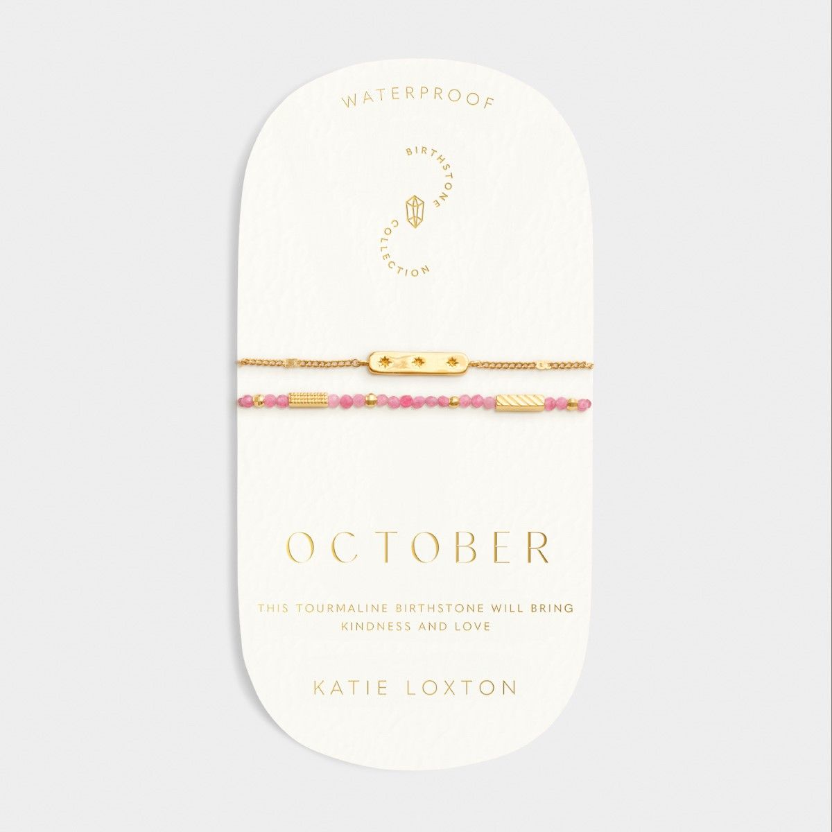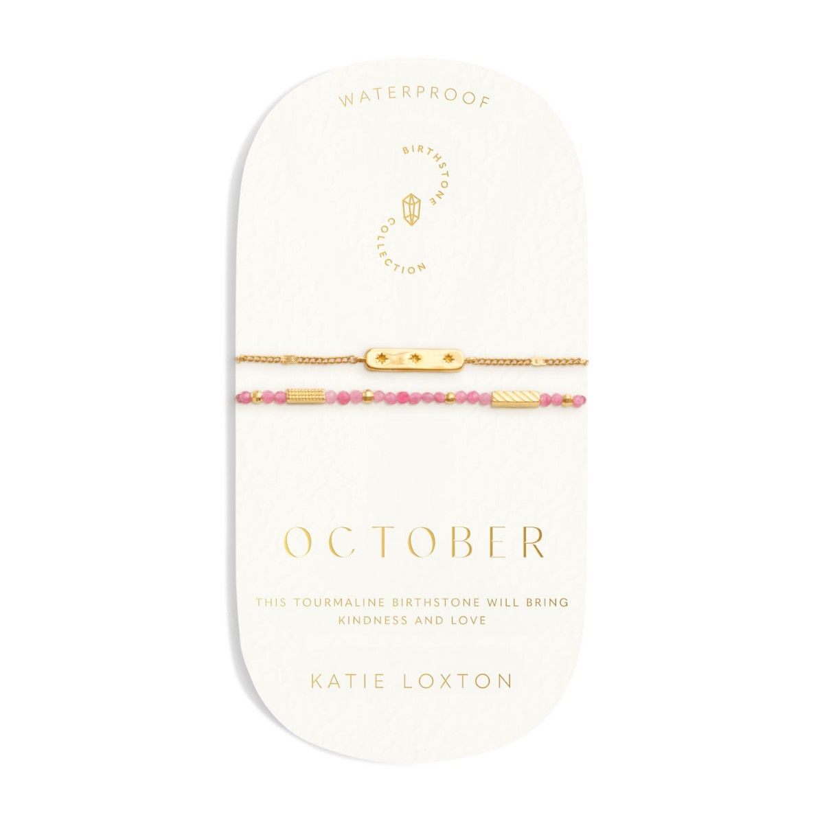 The Katie Loxton 'October' Waterproof Gold Birthstone Bracelet will be delivered in the official branded packaging for this design, as supplied by the manufacturer. For non-branded items, Niche Jewellery packaging will be supplied.