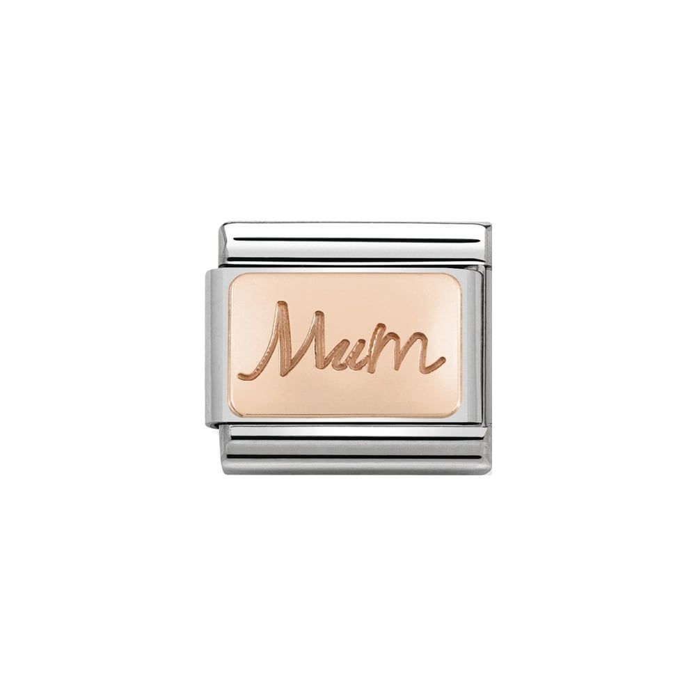 This beautiful Mum script Nomination charm is a stunning tribute to any mother. Crafted in stainless steel and plated with 9k rose gold, this is a stunning gift to give or receive.