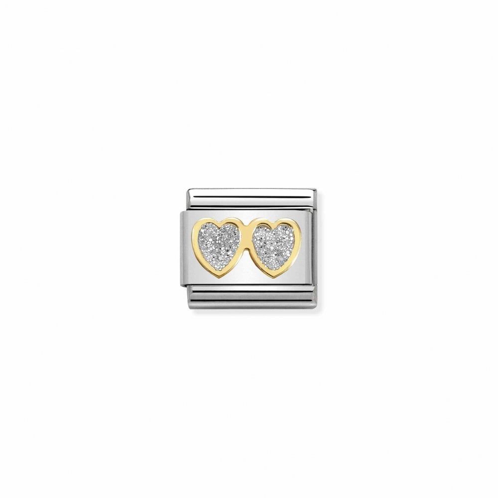 Create your own unique style or give a stylish, affordable gift with this Nomination Classic Silver Glitter Double Hearts Steel with an 18k Gold outline.
