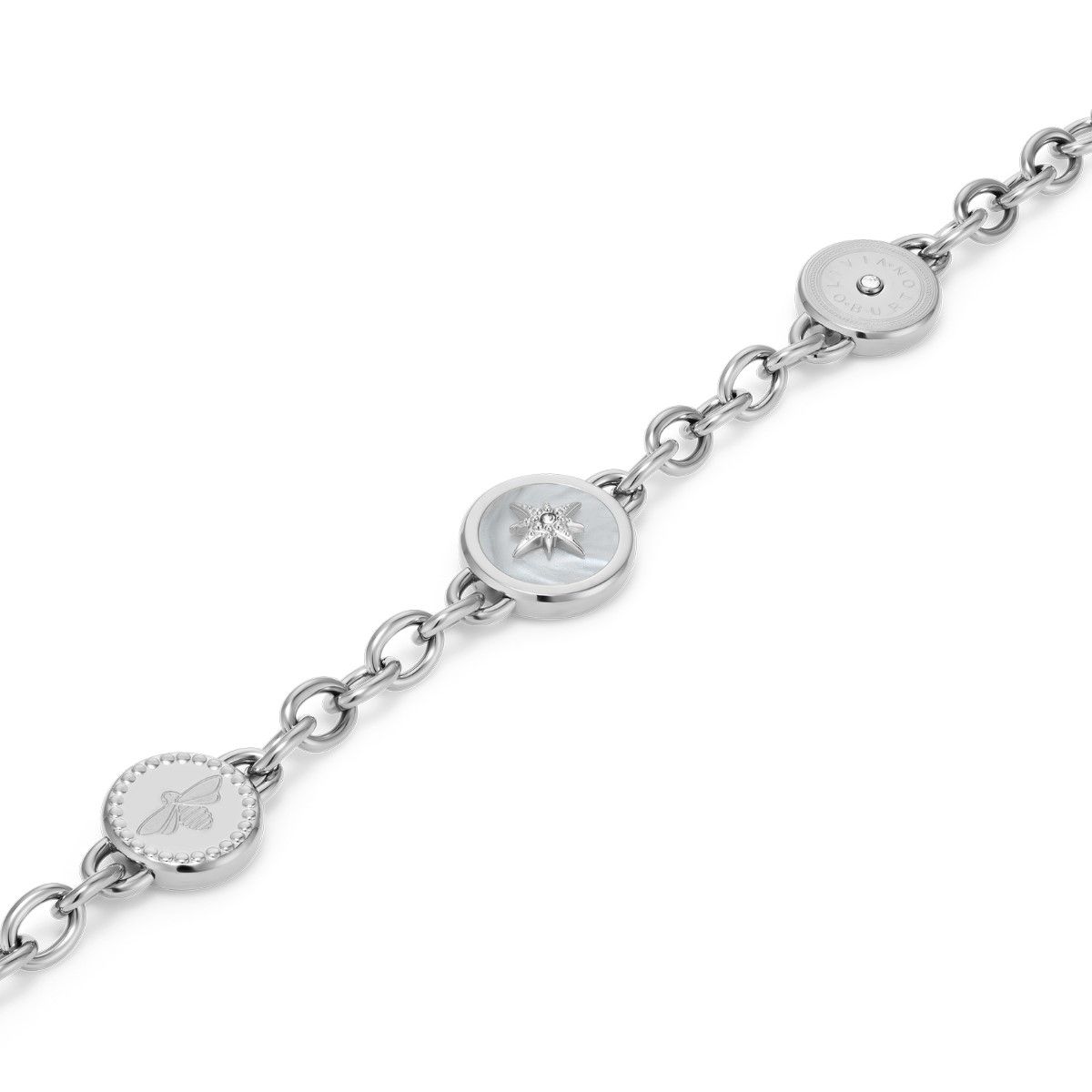 This silver-tone Olivia Burton bracelet features a trio of beautifully detailed charms. The charms include a playful bee, a North Star set on faux mother of pearl and a crystal-set disc with ribbon etching.