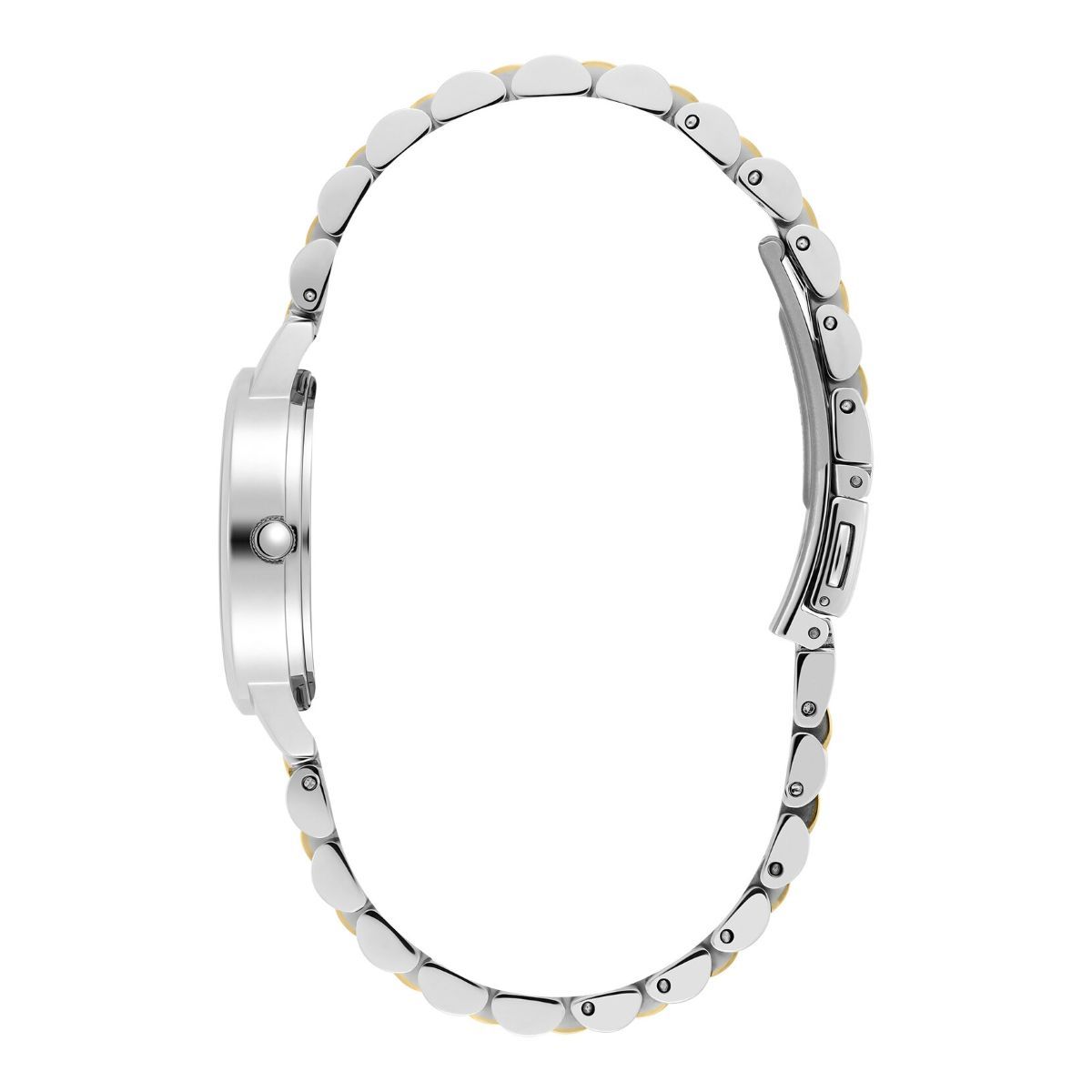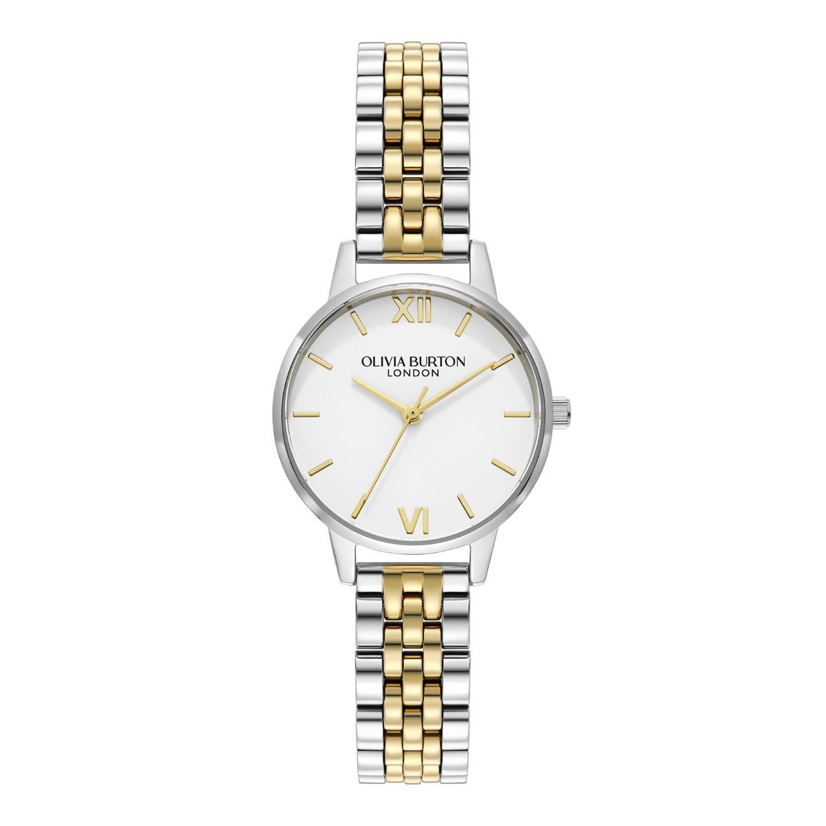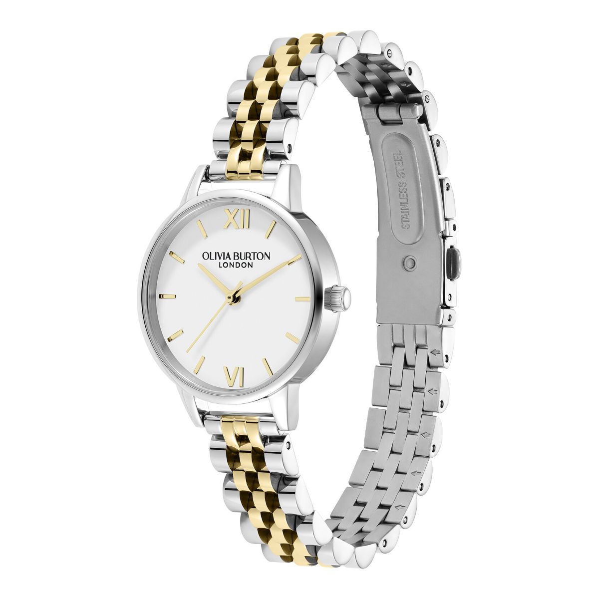 This Classic Olivia Burton watch with white dial and gold-tone markers is finished with a two-tone bracelet strap. It has a contemporary look that works with any outfit.