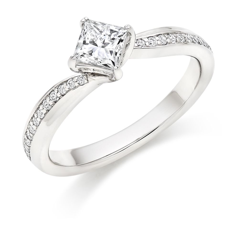 A stunning engagement ring features a favourite diamond cut with a design that is as unique and individual as she is. This princess cut engagement ring is the perfect token of commitment.