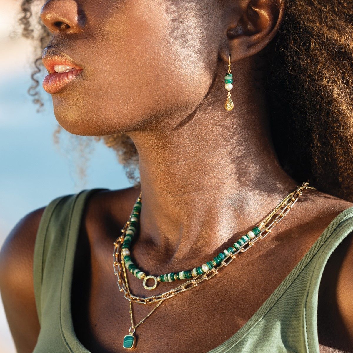 Discover the beauty of natural gemstones and stunning use of colour with this collection from Sarah Alexander jewellery. A bright and bold addition to your jewellery box, these easy on the eye earrings will add fresh styling all year round with the most sought after green and gold combo. Protection, relief from stress and success are some of the qualities associated with the natural gemstones in these earrings, making them a meaningful as well as beautiful pair or gift for a friend or loved one.