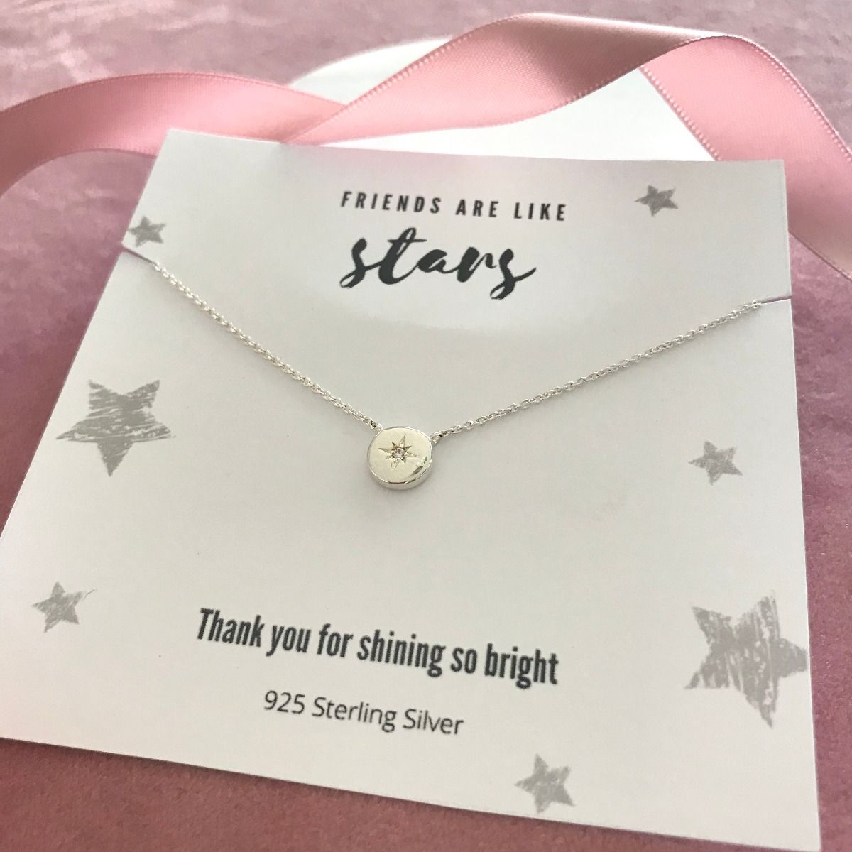 A dainty and minimalist star necklace, featuring a small disc with a white zircona star motif. Crafted from solid Sterling Silver, this makes a lovely symbol of friendship, thank you gift or treat to yourself.