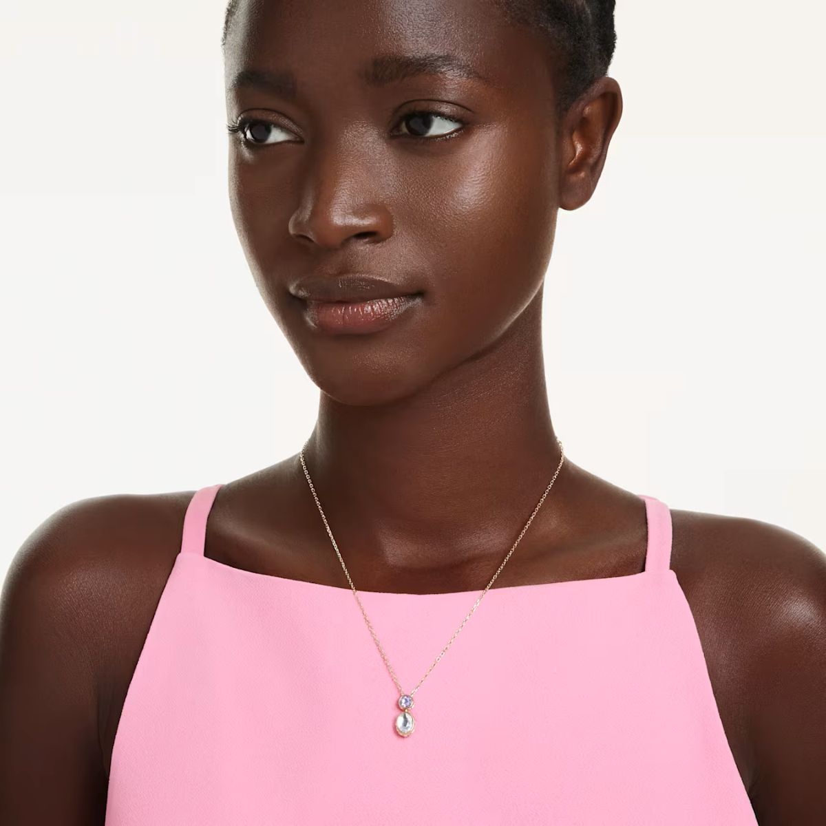 The Swarovski Chroma pendant lets you twist its crystal to match your mood. Its design includes a central purple crystal and a larger, reversible crystal below, clear on one side and pink on the other. This playful piece is perfect for expressing your personal style.
