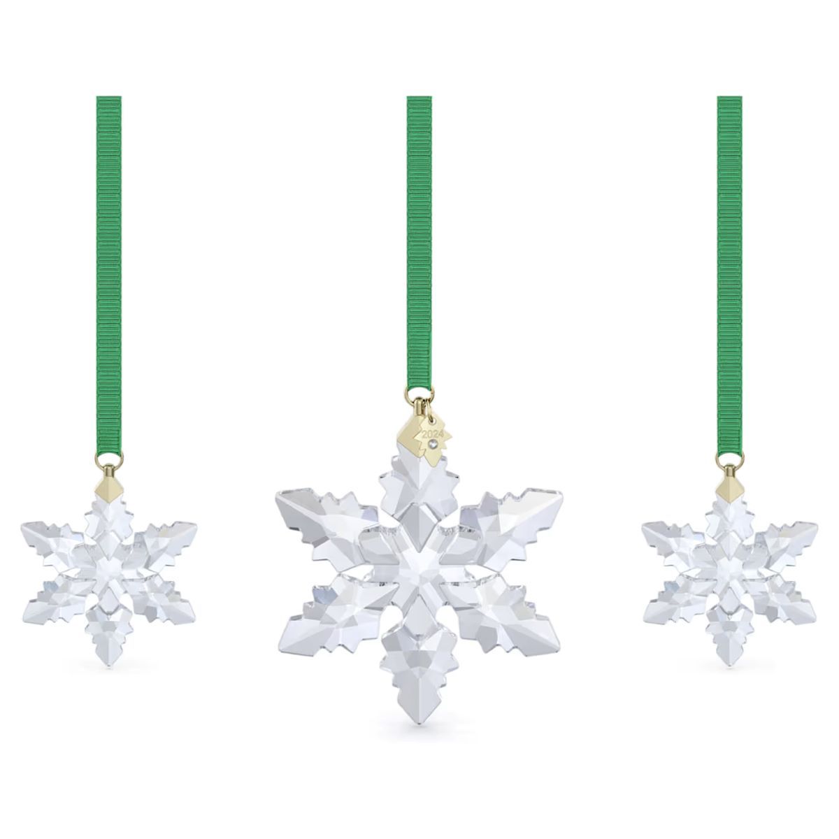 This Swarovski crystal decoration is sure to add joy to your day. Featuring sparkling facet cut crystals and outstanding design, Swarovski crystal also makes the perfect gift. The set includes two smaller ornaments and one large snowflake, which additionally features a tag engraved with “2024.” Suspended from green grosgrain ribbons with glossy gold-tone accents, this commemorative set would make a truly spectacular gift or brilliantly illuminate your own festive décor.