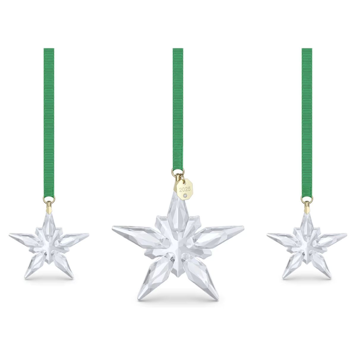 The iconic Swarovski Annual Edition Ornaments continue with this set of three clear stars, crafted with a total of 570 facets, that are inspired by the serenity of the night sky. Each star is suspended from a green grosgrain ribbon with champagne gold-tone plated accents, while the large star also includes a 2025 engraving on the tag.