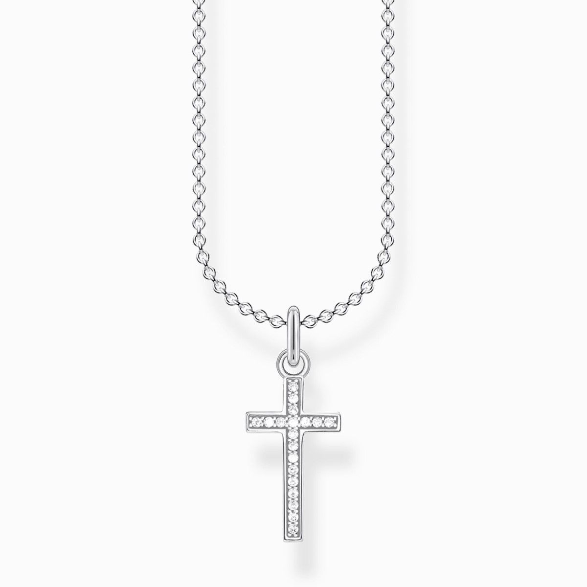 This Thomas Sabo cross necklace features clear lines and brilliant white zirconia stones set in pavé form. A delicate statement or perfect layering piece.