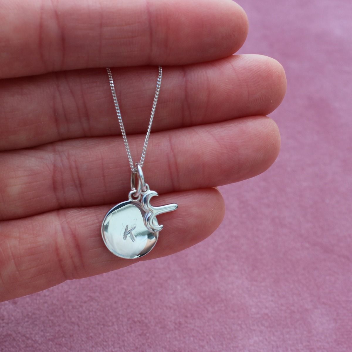 A gorgeous necklace zodiac charm and disc pendant on a dainty curb chain. All handcrafted in solid Sterling Silver. The perfect choice for a birthday gift, thank you gift, or a beautiful memento of your own zodiac sign.